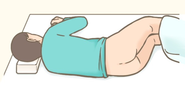 診察の最後に直腸診を行います。あまり経験されたことなない診察で、抵抗感があるかもしれませんが、大腸疾患の診察では場合には欠かすことができません。左を下にして横になり、お尻を医師に向ける姿勢で行います。肛門を視診した後に、示指を肛門から入れてゆっくりと直腸の中を触診します。